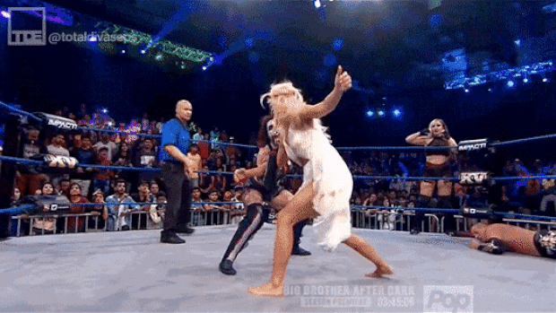 First off we see Laurel and Allie go at it, but seconds later she tags KM. Allie went on to tag Braxton because men aren’t allowed to hit girls on IMPACT. As Braxton dishes out some hurting sandwiches to KM, the cocky one tried to powerbomb Sutter only to end up on a wrong end of a rollup attempt, which happened to be a near-fall.